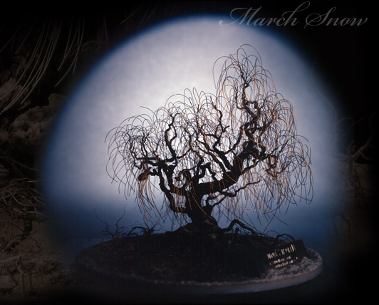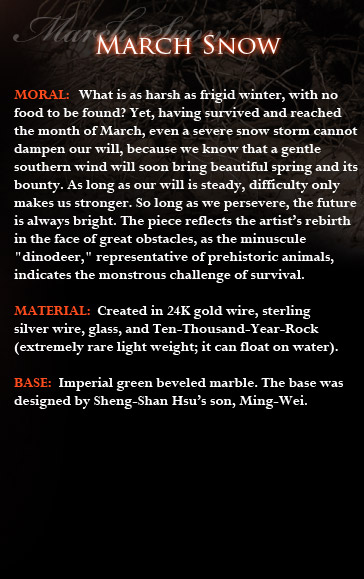 (Situated in the front of the artwork is a sterling silver name plate. The front contains the title of the work, names of the artists (father and son), and the year of the creation/copyright. Engraved on the reverse side are the birth places, signatures, and fingerprints in red of both artists, and the location of creation. A circular opening in the lower right corner of the name plate allows a silver wire to connect to the willow tree by its roots.) |